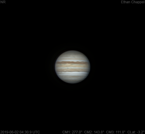 I wasn't expecting to image tonight, but I went outdoors to see the sky clearing to the south. The stars were twinkling and the sky could've clouded over at any time, so we skipped the C14 and I pulled out the 90mm Mak for a quick setup. Sky conditions were very good! I believe this is one of my best photos from this scope! Notes: The North Temperate Belt is thin. The southern edge is orange while the north is dark. The North Equatorial Belt appears to have a few new rifts. The Equatorial Zone, except for the southern edge, is still orange. The South Equatorial Belt appears to have a dark spot on its northern edge approaching the central meridian. The SEBs is dark compared to the rest of the belt. The South Polar Red Spot is past the CM.