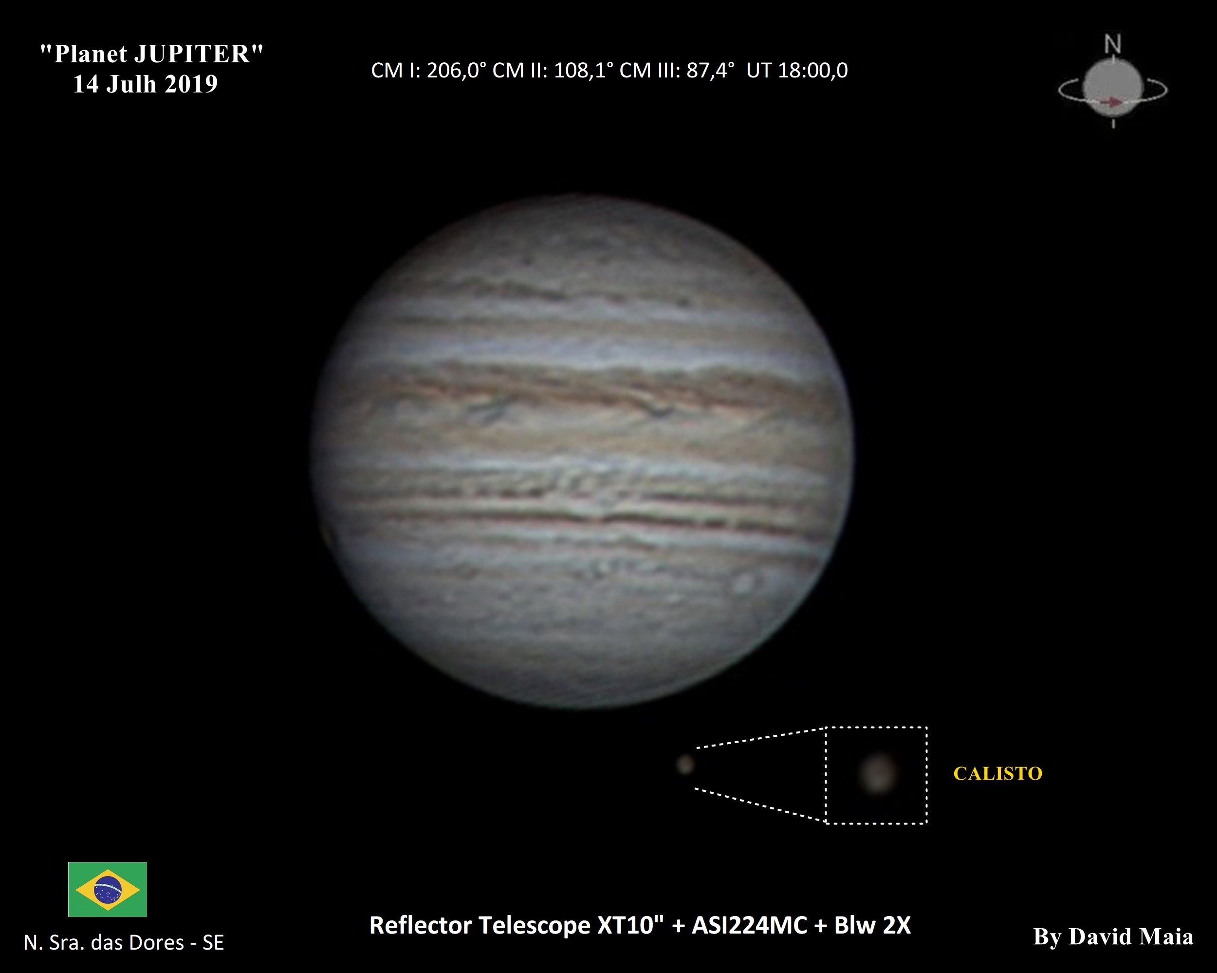 Record of Planet JUPITER and one of its "CALISTO" moons, in the image you can notice an aspect of the color of the Callisto moon south of Jupiter, in addition to its equatorial bands.