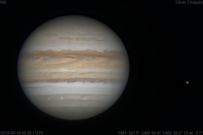 Seeing continued its crisp but turbulent nature. Notes: The Equatorial Zone, excluding its southern edge, is orange. The northern South Equatorial Belt is lighter than normal. The SEBs appears dark and clumpy. Io is approaching Jupiter from the right.