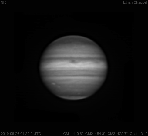 Clouds started to show up after capturing tonight's near infrared image, but I still had enough time to capture a methane image. Notes: A prominent hot spot on the northern edge of the Equatorial Zone is at the central meridian. The southern edge of the South Equatorial Belt is dark. Oval BA is rising. The South Polar Red Spot has passed the central meridian.