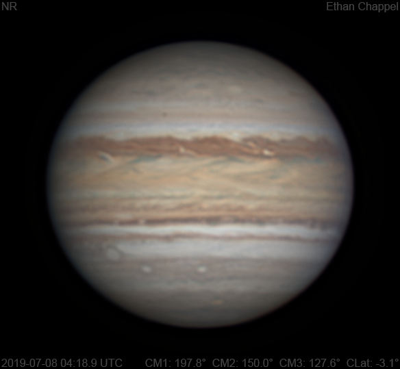 Despite the breezy weather prohibiting the use of the CGEM DX and C14 for the second night straight, tonight was another good summer night for planetary imaging. Notes: The NEBn contains a few small white ovals. The NEB contains a few rifts. The Equatorial Zone is still orange. Oval BA and the STB Ghost are rising together. The South Polar Red Spot stands out in the south polar regions.