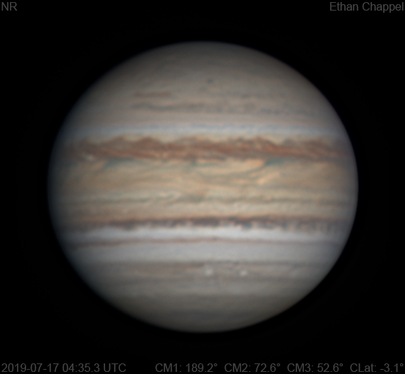 Yet again a night of good seeing, but too windy for the CGEM DX/C14. Notes: The NNTB has a brown barge approaching the central meridian. The NEBn is ragged. The Equatorial Zone is orange and has a lot of festoon activity. The SEBn is whiter than the EZ. The SEBs is dark and clumpy.