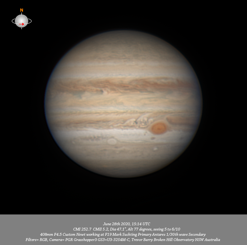 Imaged Jupiter June 28th in good seeing but initially poor transparency with all of the Ch4 and some of the 685nm IR data captured through cloud which was moving through quite quickly. That said the 685nm IR data is very good with an excellent depth of quite intricate detail resolved pole to pole and limb to limb. The NEB has considerable fine structure resolved in it while the fine structure resolved within the EZ is exquisite. The SEB structure following the GRS looks particularly interesting, circulation within the GRS is seen and the GRS chimney is open. Two tiny dark spots below and to the F side of the GRS are well resolved as is the dark elongated spot below the GRS in the STZ. Oval BA is well resolved as is the zigzag structure following it. Two small dark spots are seen below Oval BA with one leading and the other trailing it; a small bright oval is well resolved in the SSTB below the GRS. The R, G & B data was not affected by cloud, the R channel resolves all detail described for the IR as does the RGB data other than for the very fine structure seen in the EZ in the IR & R data. Regards Trevor