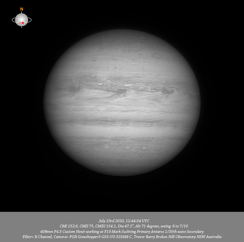 R channel data. Imaged Jupiter July 23rd in good seeing, have exceptional depth of resolved detail from pole to pole and limb to limb. I note a small red oval on the Southern edge of the NPR toward the P limb. A line of tiny compact dark spots in the NTB are resolved in all wavelengths, even Ch4. Quite intricate structure is resolved through the NEB with three prominent dark features associated with festoons seen along the Southern edge of the NEB. Very intricate detail is resolved in a thin band along the Southern edge of the EZ and fine structure is resolved in the SEB. A formation of three centrally located small bright ovals are well resolved in the SSTB with a smaller bright oval toward the F limb.