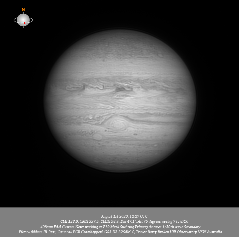 685nm IR data. Imaged Jupiter August 1st in good seeing have very good depth of resolved detail everywhere. I note a prominent red oval near the P limb in the NNTB which would likely be LRS-1; following this oval is a very prominent very thin dark strip. Many quite tiny bright spots in the NPR are well resolved particularly in 685nm IR and R data. Very delicate structure is seen along the Northern edge of the NEB, particularly in the B channel data. Quite intricate structure is resolved through the NEB from limb to limb with a very bright spot seen to the P side of the CM at all wavelengths. Three prominent dark features are spaced across the Southern edge of the NEB associated with festoons. Intricate structure is resolved in the EZ in IR and R channel data. Intricate detail is resolved in a thin band along the EZ SEB border. The disturbed region following the GRS in the SEB is very well resolved with a prominent bright spot within it resolved at all wavelengths. Circulation is seen within the GRS with a line of at least three tiny dark spots very near the Southern edge of the GRS; another tiny dark spot is on the actual trailing edge of the GRS with other tiny dark spots on the P edge. Clydes spot is resolved toward the P limb in the STB. DS6 is very well resolved in the STB preceding the GRS. As Bird noted in his data from the same date, DS6 clearly has two components they are well resolved as two separate components in the IR, R, G, B and RGB data from this session. Oval BA is well resolved in the STB as is the disturbed region following it with a very small bright oval (STZ-AWO) close to the F limb. The small bright oval (A8) is resolved toward the P limb in the SSTB. Many tiny dark spots are resolved in the SPR.