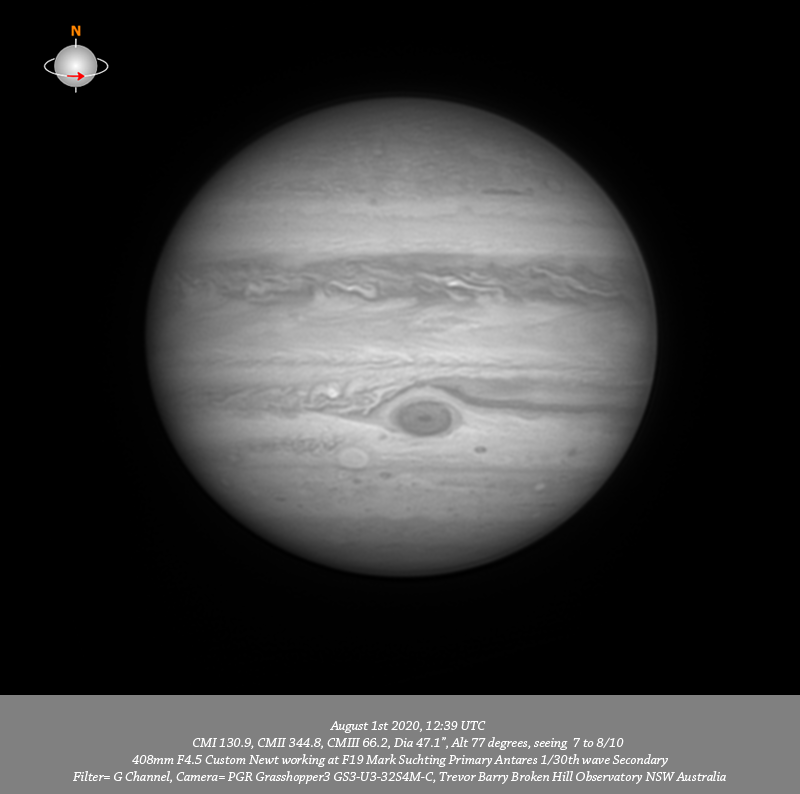 G channel data. Imaged Jupiter August 1st in good seeing have very good depth of resolved detail everywhere. I note a prominent red oval near the P limb in the NNTB which would likely be LRS-1; following this oval is a very prominent very thin dark strip. Many quite tiny bright spots in the NPR are well resolved particularly in 685nm IR and R data. Very delicate structure is seen along the Northern edge of the NEB, particularly in the B channel data. Quite intricate structure is resolved through the NEB from limb to limb with a very bright spot seen to the P side of the CM at all wavelengths. Three prominent dark features are spaced across the Southern edge of the NEB associated with festoons. Intricate structure is resolved in the EZ in IR and R channel data. Intricate detail is resolved in a thin band along the EZ SEB border. The disturbed region following the GRS in the SEB is very well resolved with a prominent bright spot within it resolved at all wavelengths. Circulation is seen within the GRS with a line of at least three tiny dark spots very near the Southern edge of the GRS; another tiny dark spot is on the actual trailing edge of the GRS with other tiny dark spots on the P edge. Clydes spot is resolved toward the P limb in the STB. DS6 is very well resolved in the STB preceding the GRS. As Bird noted in his data from the same date, DS6 clearly has two components they are well resolved as two separate components in the IR, R, G, B and RGB data from this session. Oval BA is well resolved in the STB as is the disturbed region following it with a very small bright oval (STZ-AWO) close to the F limb. The small bright oval (A8) is resolved toward the P limb in the SSTB. Many tiny dark spots are resolved in the SPR.