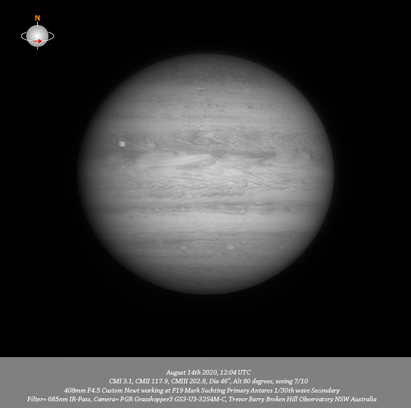 685nm IR data. Imaged Jupiter August 14th initially in rather ordinary seeing but which improved significantly toward the end of my Jupiter run especially so for the 2nd 685nm IR and Ch4 data. The depth of resolved detail across the field in the 1st IR, R and RGB images is more a reflection on just how good the processing tools we have at out fingertips have evolved rather than the quality of the data. Of significance in these data is the very large diffuse dark feature toward the F limb in the NEB. Most of this apparition there have been quite condensed dark features along the Southern edge of the NEB seemingly associated with festoons which seem to emanate from them. In these data each of the festoons has a large diffuse dark feature extending the width of the NEB above them but the one toward the F limb is more prominent. There is also a line of three white ovals seen in the SSTB. Europa is in transit.