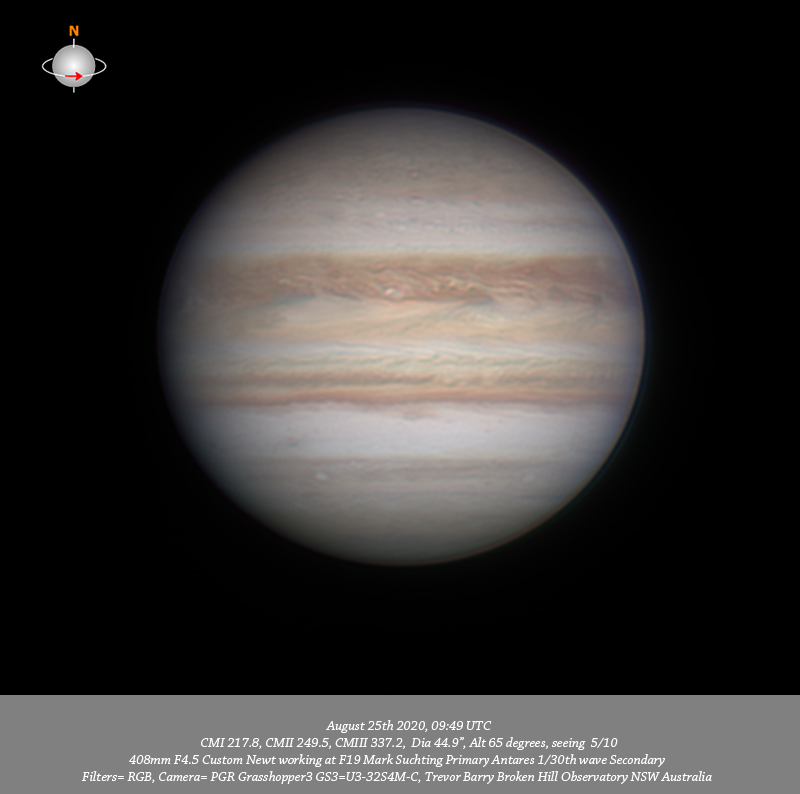 RGB data. Imaged Jupiter August 25th, seeing was steady but a little soft. A tiny bright spot is resolved in all data near the CM on the edge of the NPR. Four v-small compact bright spots are resolved also near the CM in the NEB. Quite intricate structure is resolved within the NEB, EZ and SEB . A quite elongated blue spot is resolved near the Southern edge of the SEB in the STrZ near the CM and a small bright oval is resolved toward the F limb in the STeB.
