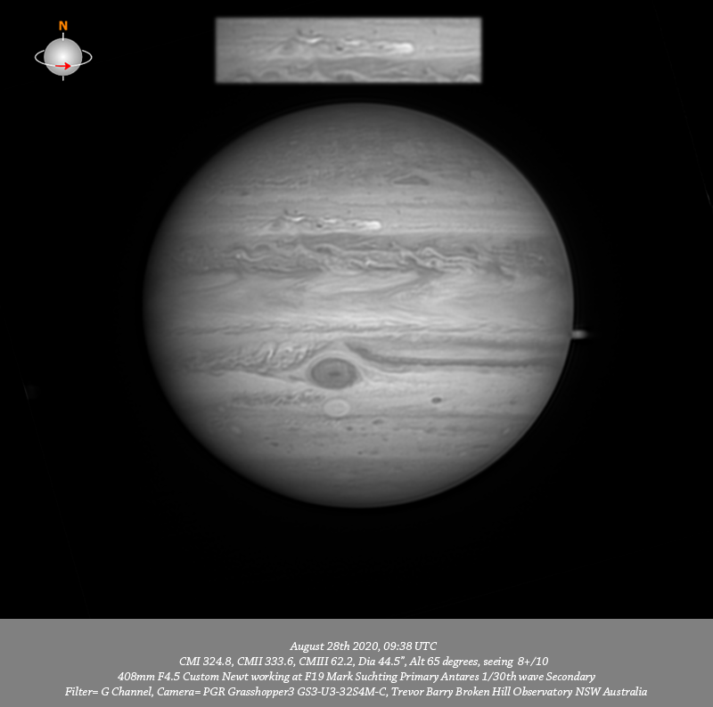 Imaged Jupiter August 28th in very good seeing, have exceptional data across all wavelengths, the resolved detail in the live feed from my Grasshopper 3 was extraordinary. I note a very elongated red feature on the Southern edge of the NPR between the CM and P limb. The NTrZ outburst is extremely well resolved, it looks somewhat like a comet with the tail streaming behind. The intricate structure within the NEB is well resolved with a concentrated tiny bright spot toward the F limb and another near the CM. The dark features along the Southern edge of the NEB associated with festoons in the EZ are well seen. I note that the GRS chimney has opened again and circulation within the GRS is resolved. The structure of the disturbed region following the GRS in the SEB is very well resolved as is Oval BA and the disturbed region in the STZ following it. DS6 resolves into two separate dark spots while Clyde’s spot is near the P limb. Many tiny dark spots a re resolved in the SSTrB and SSTeB and even further into the SPR.