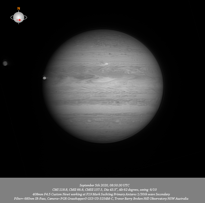 685nm IR data. Imaged Jupiter September 5th targeting a CM transit of the NTrZ #2 outbreak. The session started quite early with the sky very bright and the image still a little unstable but improved as time went on. Have nice depth of detail across the field I note a small red oval on the Southern edge of the NPR toward the P limb with a formation of v-small dark spots aligned in the NNTeB. The head of the NTrZ #2 outburst is quite concentrated and I measure it to be at approx Lat+23.5 L1 114.4 there is an associated trail extending down and to the west I measure this section to be centered on approx Lat+22.1; the 685nm IR, R and RGB data resolves a darker feature streaming back and also to the west this darker feature is very bright in CH4 and UV data. The intricate structure within the EZ and SEB is reasonably well resolved. A formation of four bright ovals is aligned in the SSTeB.