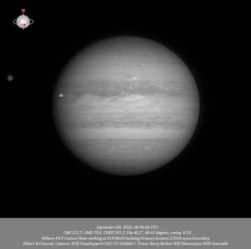 R channel data. Imaged Jupiter September 5th targeting a CM transit of the NTrZ #2 outbreak. The session started quite early with the sky very bright and the image still a little unstable but improved as time went on. Have nice depth of detail across the field I note a small red oval on the Southern edge of the NPR toward the P limb with a formation of v-small dark spots aligned in the NNTeB. The head of the NTrZ #2 outburst is quite concentrated and I measure it to be at approx Lat+23.5 L1 114.4 there is an associated trail extending down and to the west I measure this section to be centered on approx Lat+22.1; the 685nm IR, R and RGB data resolves a darker feature streaming back and also to the west this darker feature is very bright in CH4 and UV data. The intricate structure within the EZ and SEB is reasonably well resolved. A formation of four bright ovals is aligned in the SSTeB.