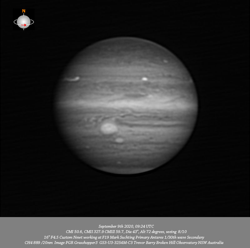 CH4 data.Imaged Jupiter September 9th in good seeing have very nice depth of detail across the field. I note a prominent red oval toward the P limb on the Southern edge of the NPR. There is considerable fine detail within the NPR. Quite prominent in R, G, B, & UV is a thin red band near the CM on the Southern edge of the NPR. NTeZ outbreak #3 is near the CM while outbreak #2 is coming in from the F limb. The intricate detail within the NEB is well seen with several concentrated bright spots. Two prominent dark regions associated with festoons in the EZ are seen on the Southern edge of the NEB. The GRS chimneys remains open and Oval BA has a prominent ring within it resolved in R, G & B data. Clydes spot is toward the P limb while DS6 is resolved as two separate spots in all 685nm IR, R, G & B data. Very fine detail is resolved in the disturbed region following Oval BA and many v-small dark spots are resolved in the STB & SSTeB with a red oval resolved toward the F limb in the SPR. The CH4 data resolves a bright spot within the GRS chimney.