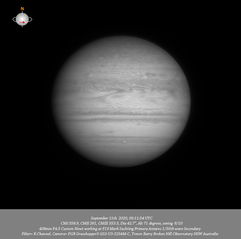 R channel data. Imaged Jupiter September 11th in fair to good seeing. There are many very fine spots resolved within the NPR, a prominent red oval is resolved on the Southern edge of the NPR initially toward the F limb but passing the CM by the end of the session. Outbreak #3 initially is toward the F limb, a quite interesting v-thin bright band preceding #3 is stretched diagonally across NTrZ, I suspect the two dark elongated features that the thin bright band rub into toward the P limb may be the extremities of the turbulent #1 tail. There is a prominent v-compact bright spot embedded in the NEB just past the CM toward the P limb. Two dark features are seen on the Southern edge of NEB associated with festoons in the EZ. Clyde's spot is near the CM with DS6 toward the F limb both in the STeZ. A very prominent bright oval is resolved near the CM in the SSTB. Outbreak #2 is seen rotating in from the F limb by the end of the session as is Oval BA and the GRS.