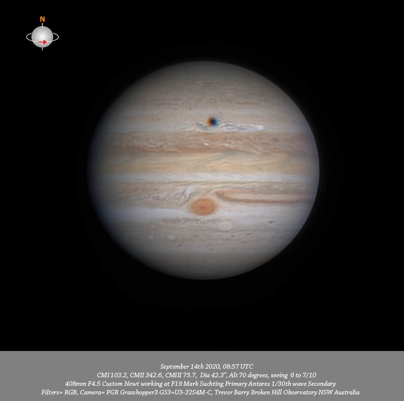 RGB data. Imaged Jupiter September 14th in good seeing. Have a good depth of resolved detail across the field. I note a v-thin red band toward the P limb on the Southern edge of the NPR, many v-fine details are resolved within the NPR. There is a shadow transit of Callisto within the wake of the #2 outburst. Quite intricate structure is resolved within the NEB and the is a v-compact bright spot near the CM.Three dark features along the Southern edge of the NEB associated with festoons are seen, most prominent in IR. The GRS chimney remains open and circulation can be seen within the GRS. The disturbed region immediately following the GRS is very well resolved. DS6 resolves as two separate dark spots, Oval BA is well resolved as is it’s fine inner ring. The disturbed region following Oval BA is well resolved as is STZ-AWO. Bright ovals A1 and A2 are seen in the SSTeB and red oval S4-LRS-1 is resolved near the CM within the SPR.