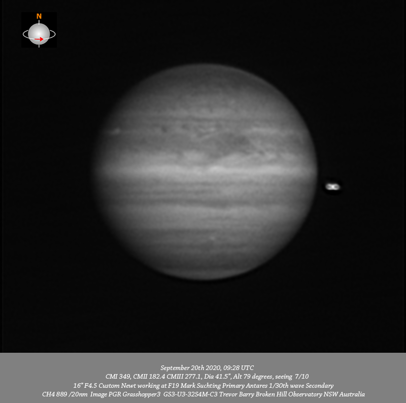 CH4 data. Imaged Jupiter September 20th in very ordinary seeing. STrZ outbreak #3 is resolved in all data but possibly best seen in the R and RGB data just to the P side of the CM #2 is seen toward the F limb.