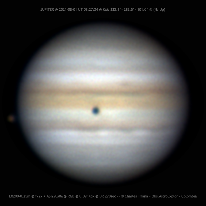 Jupiter 2021/08/01 (UT) 08:27:24 CM= 332.3°/282.5°/101.0° SCT LX200UHTC 0.25m + Barlow 2x + ASI290MM + RGB Filters @ 0.09”/pixel (f/27) RGB: 1240/1870/1222 frames @ 41/44/47 fps @ 270sec (DR) S: 4/10 – T: 3/5 – Alt: 54° Charles Triana Bogota-Colombia