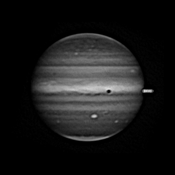 Io exiting transit at preceding limb, distorted due to processing. Io shadow in transit over EZs. Oval BA bright in STZ.