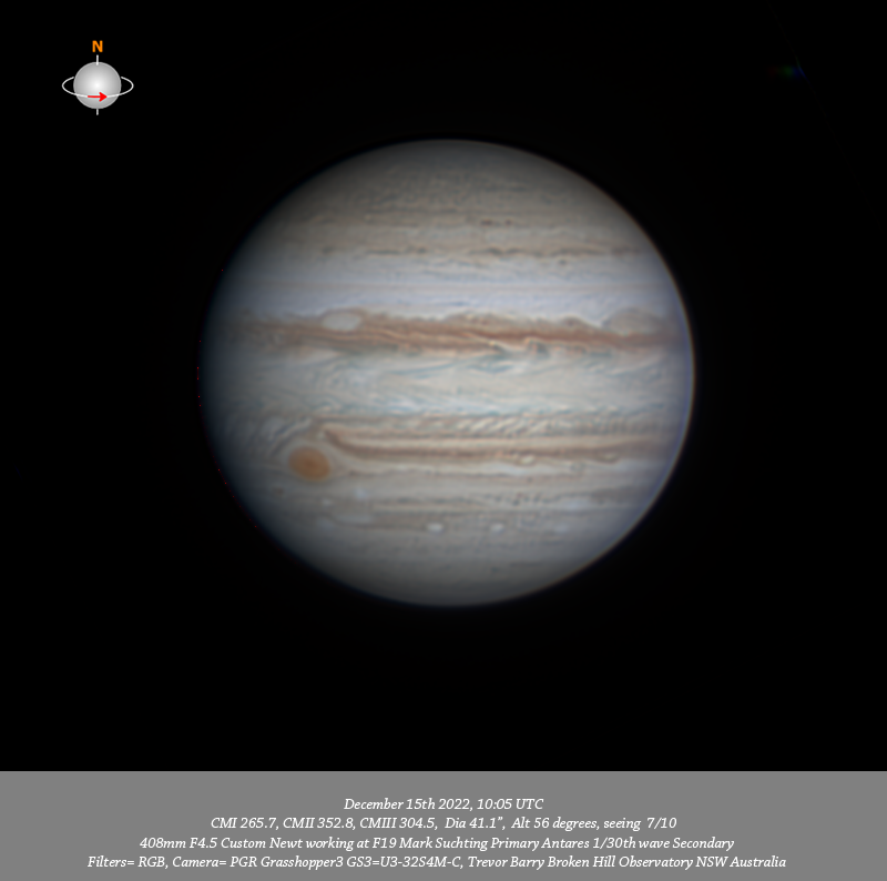RGB data. Imaged Jupiter December 15th in good seeing the day of the PJ47 flyby. The track of PJ47 would have been well over the Eastern limb however these data resolve an excellent depth of detail across the field. I particularly note the very well defined small bluish oval toward the P limb in the STrZ this is well defined at all wavelengths.