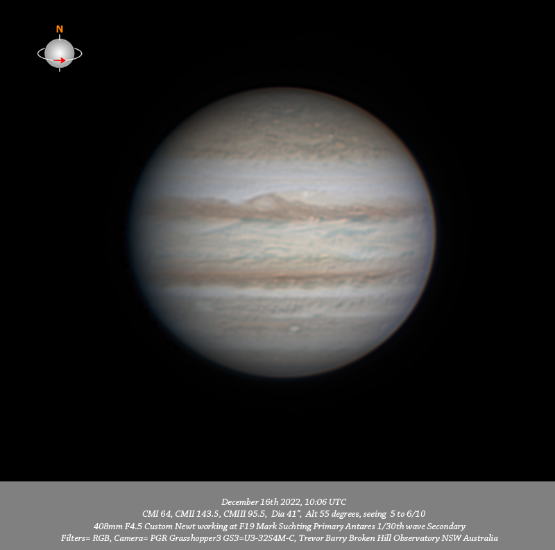 RGB data. Imaged Jupiter December 16th 2022, the day after PJ47 flyby. The track of the flyby is very near the F limb in the final 685nm IR data set of this session. Considerable small scale detail is resolved particularly in the IR and R data including several small red spots within the NPR with NN-WS-6 very prominent. Of particular interest a compact bright spot WS-B is well resolved in the NTrZ and is very closely preceded by another v-small compact bright spot.