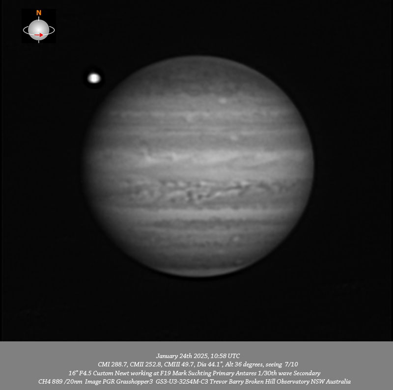Detail resolved in these data A bright oval mid NTB only in CH4 data. A bright oval in the NEB adjacent to the NTrZ resolved at all wavelengths. A dark barge in the NEB with a disturbance emanating down to the P side of the barge at all wavelengths. Several prominent festoons in the EZ at all wavelengths. A v-compact bright spot mid SEB resolved in 685nm IR, R and RGB this is preceded by a larger compact bright spot. The SEB outbreak is well resolved at all wavelengths. A prominent small bright oval in the SSTB resolved at all wavelengths. A small bright oval in the SPR best seen in CH4 but also faintly resolved in 685nm IR, R and RGB.