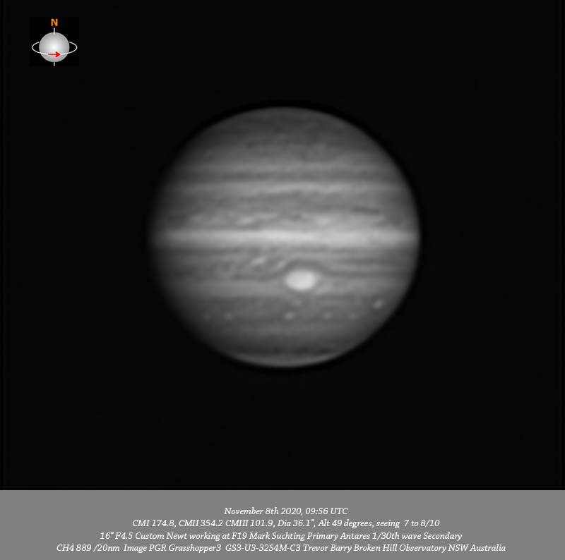 CH4 data. Imaged Jupiter November 8th in reasonable seeing. Have good depth of resolved detail across the planet. I believe I have resolved N5-AWO in the NPR. Quite fine detail is resolved in the NEB with two prominent dark features along it’s Southern edge associated with festoons in the EZ. Circulation is seen within the GRS and the disturbed region following the GRS is well resolved. Oval BA is seen as is STZ-AWO immediately below the GRS on the edge of the STrB. A formation of five bright ovals is are resolved in the SSTeB being A5, A4, A3, A2 & A1. The IR , R and RGB also resolve S4-LRS-1 in the SPR.