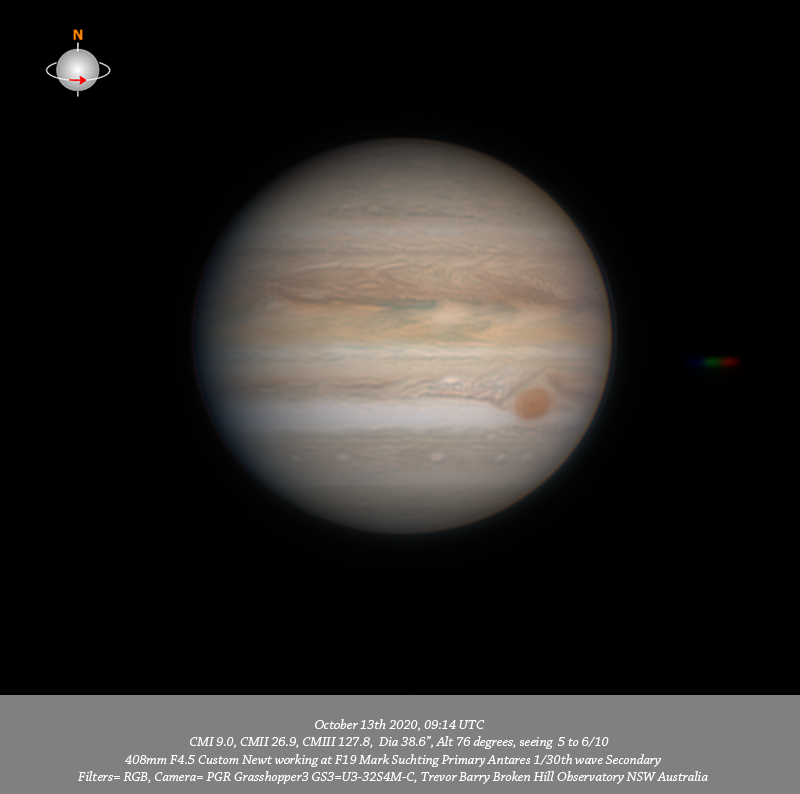 Imaged Jupiter October 13th in good seeing but with considerable amounts of cloud moving through. The first 685nm IR and R channel data was quite reasonable the G channel data was slightly cloud effected while the B channel, sadly was significantly cloud effected with more than half of that data lost. That said the overall results were reasonable. I note a small red oval in the NNTeB just shy of the CM in the RGB. Quite fine & intricate structure is resolved within the NEB best seen in the first IR data set with three prominent dark features along the Southern edge of the NEB associated with festoons in the EZ. The GRS chimney remains open and detail within the SEB immediately trailing the GRS is well resolved. I note a very bright, compact elongated spot within the SEB trailing the GRS. All data well resolves a small bright oval in the STrB trailing the GRS. These data resolve a series of five bright ovals lined up in the SSTeB.