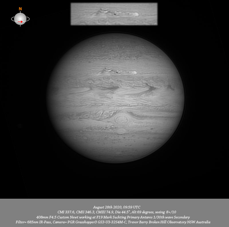 685nm IR data. Imaged Jupiter August 28th in very good seeing, have exceptional data across all wavelengths, the resolved detail in the live feed from my Grasshopper 3 was extraordinary. I note a very elongated red feature on the Southern edge of the NPR between the CM and P limb. The NTrZ outburst is extremely well resolved, it looks somewhat like a comet with the tail streaming behind. The intricate structure within the NEB is well resolved with a concentrated tiny bright spot toward the F limb and another near the CM. The dark features along the Southern edge of the NEB associated with festoons in the EZ are well seen. I note that the GRS chimney has opened again and circulation within the GRS is resolved. The structure of the disturbed region following the GRS in the SEB is very well resolved as is Oval BA and the disturbed region in the STZ following it. DS6 resolves into two separate dark spots while Clyde’s spot is near the P limb. Many tiny dark spots a re resolved in the SSTrB and SSTeB and even further into the SPR.