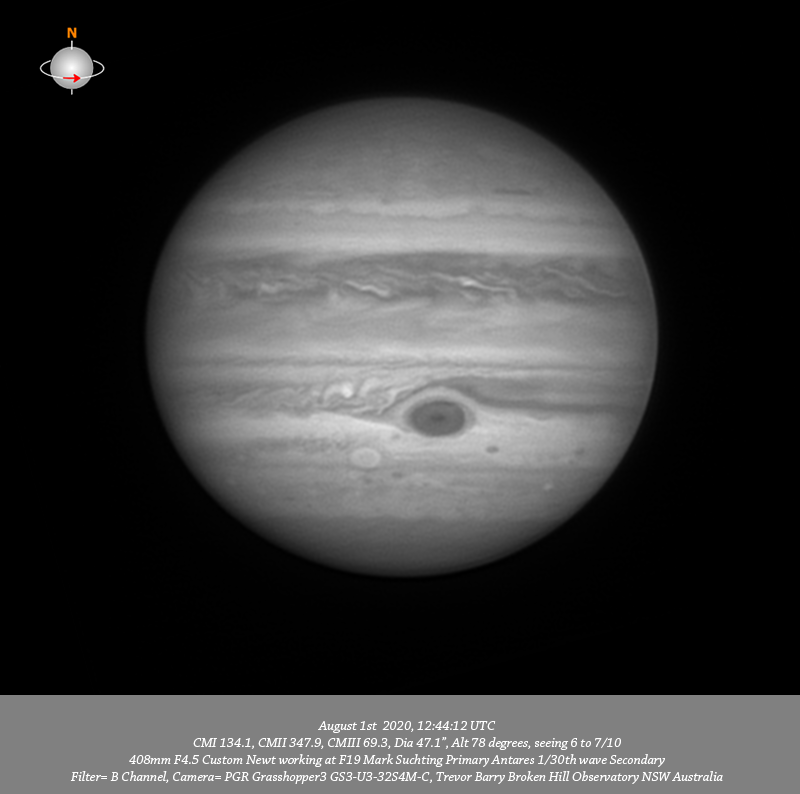 - B channel data. Imaged Jupiter August 1st in good seeing have very good depth of resolved detail everywhere. I note a prominent red oval near the P limb in the NNTB which would likely be LRS-1; following this oval is a very prominent very thin dark strip. Many quite tiny bright spots in the NPR are well resolved particularly in 685nm IR and R data. Very delicate structure is seen along the Northern edge of the NEB, particularly in the B channel data. Quite intricate structure is resolved through the NEB from limb to limb with a very bright spot seen to the P side of the CM at all wavelengths. Three prominent dark features are spaced across the Southern edge of the NEB associated with festoons. Intricate structure is resolved in the EZ in IR and R channel data. Intricate detail is resolved in a thin band along the EZ SEB border. The disturbed region following the GRS in the SEB is very well resolved with a prominent bright spot within it resolved at all wavelengths. Circulation is seen within the GRS with a line of at least three tiny dark spots very near the Southern edge of the GRS; another tiny dark spot is on the actual trailing edge of the GRS with other tiny dark spots on the P edge. Clydes spot is resolved toward the P limb in the STB. DS6 is very well resolved in the STB preceding the GRS. As Bird noted in his data from the same date, DS6 clearly has two components they are well resolved as two separate components in the IR, R, G, B and RGB data from this session. Oval BA is well resolved in the STB as is the disturbed region following it with a very small bright oval (STZ-AWO) close to the F limb. The small bright oval (A8) is resolved toward the P limb in the SSTB. Many tiny dark spots are resolved in the SPR.