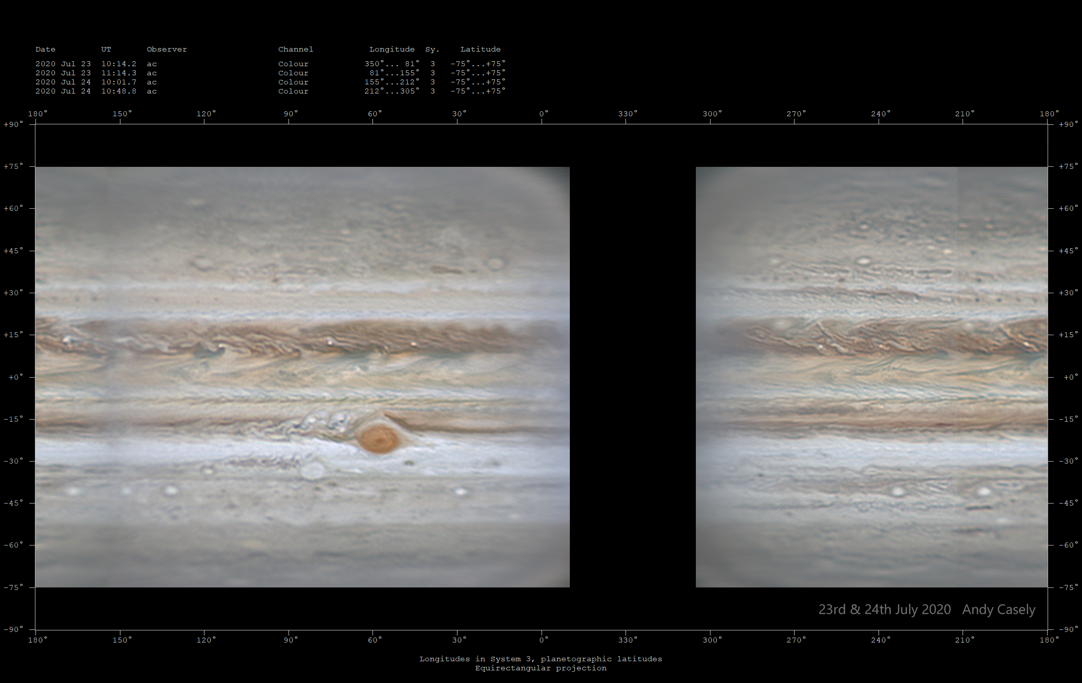 Equirectangular map from 23rd-24th July data, composed of 4 images, dates and longitudes indicated in the legend (24th: 155-305deg)
