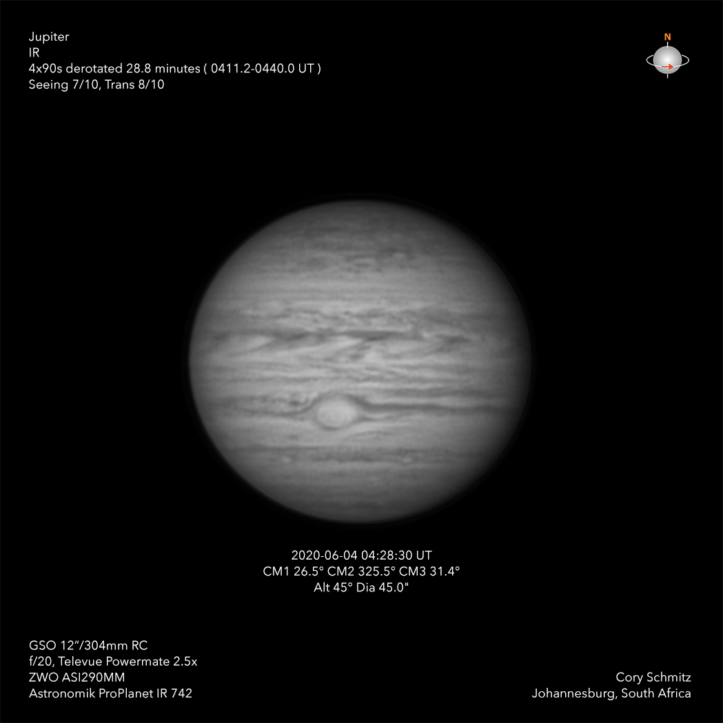 IR: Observer: Cory Schmitz 2020/06/04 04:28:30(UT) CM1=26.5 12" / 304mm RC : ZWO ASI290MM + IR 742 filter Seeing 7/10 Trans 8/10