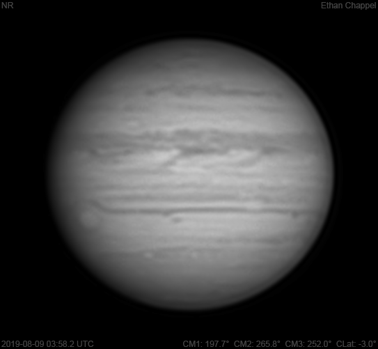 A decent night for imaging Jupiter. The area of the impact from two nights before is not visible, but no scar was left behind. Notes: White Oval Z looks bright on its northern edge. The Great Red Spot is rising.