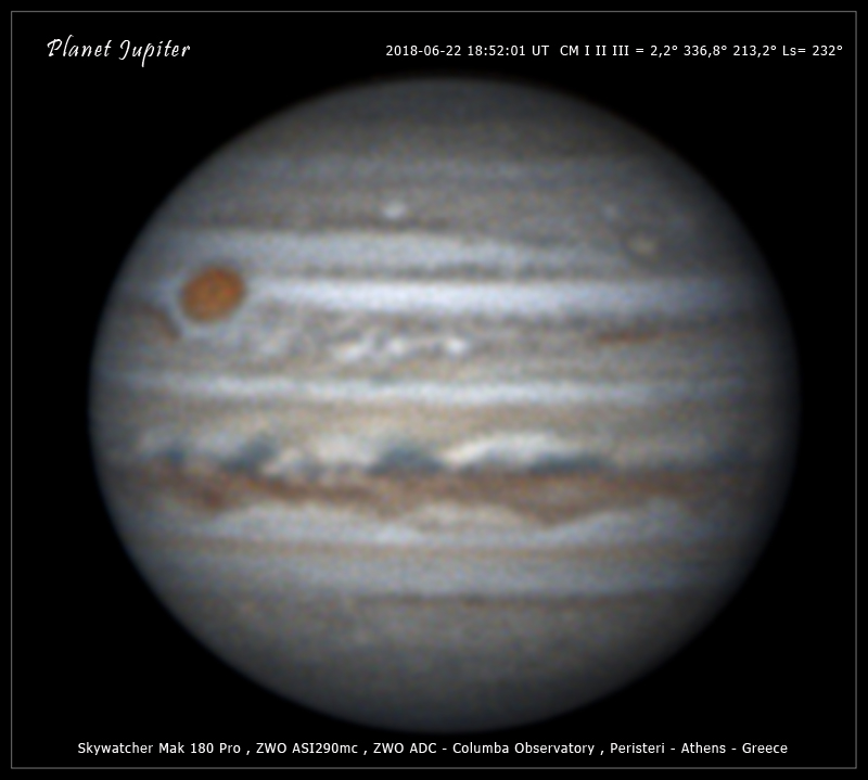 2018-06-22 18:52.01 (UT) CM I = 2,2° CM II = 336,8° CM III = 213,2° Ls = 232° Telescope: Skywatcher skymax 180 Pro - ZWO ASI290mc - ZWO ADC