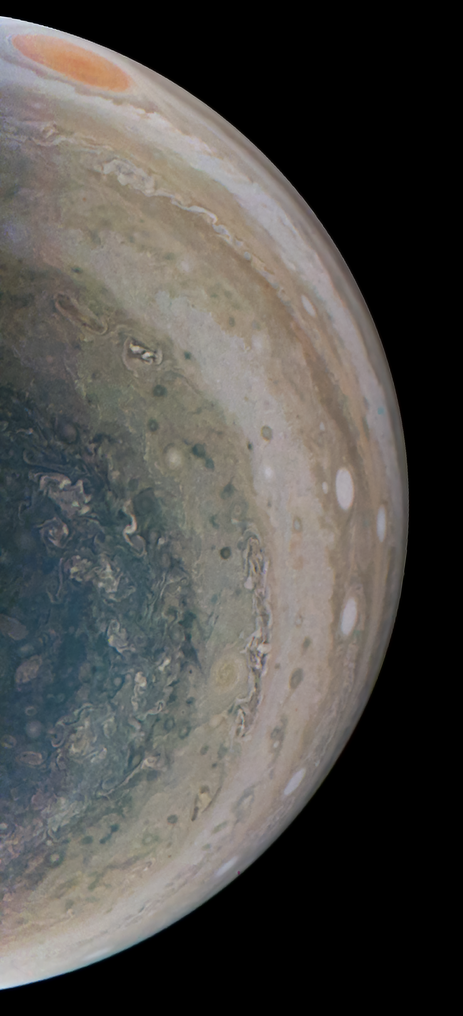 As Juno sped away from Jupiter during PeriJove 32 it captured the Great Red Spot along with a few white ovals from the ''String of Pearls''.