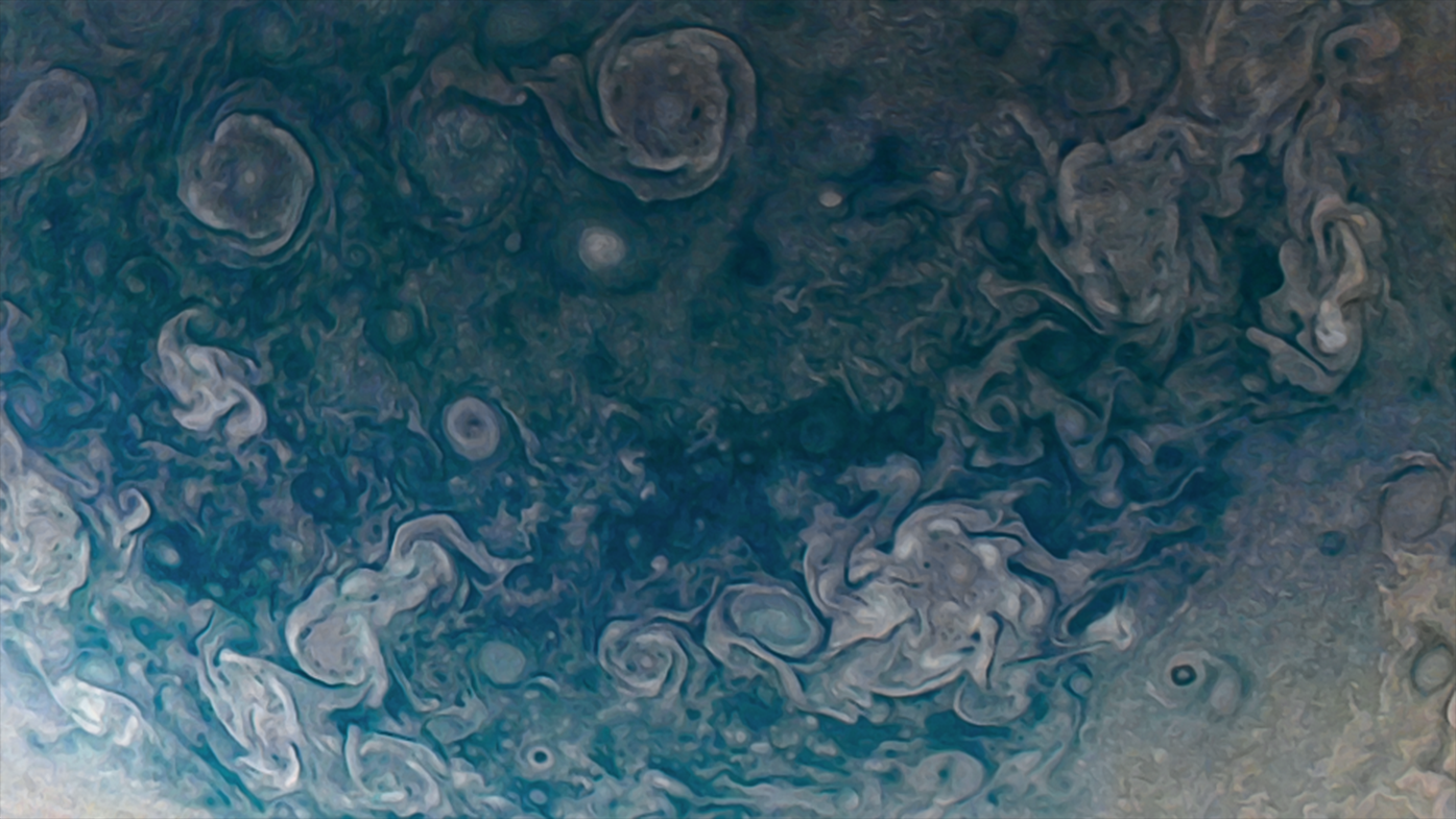 Processed using the JunoCam imager's PJ42 Northern Circumpolar Cyclones raw images and data from NASA's Juno spacecraft flyby on May 23, 2022. Enhanced to highlight features, clouds, colours, and the beauty of Jupiter. Artist's impression - not representative of true colour.