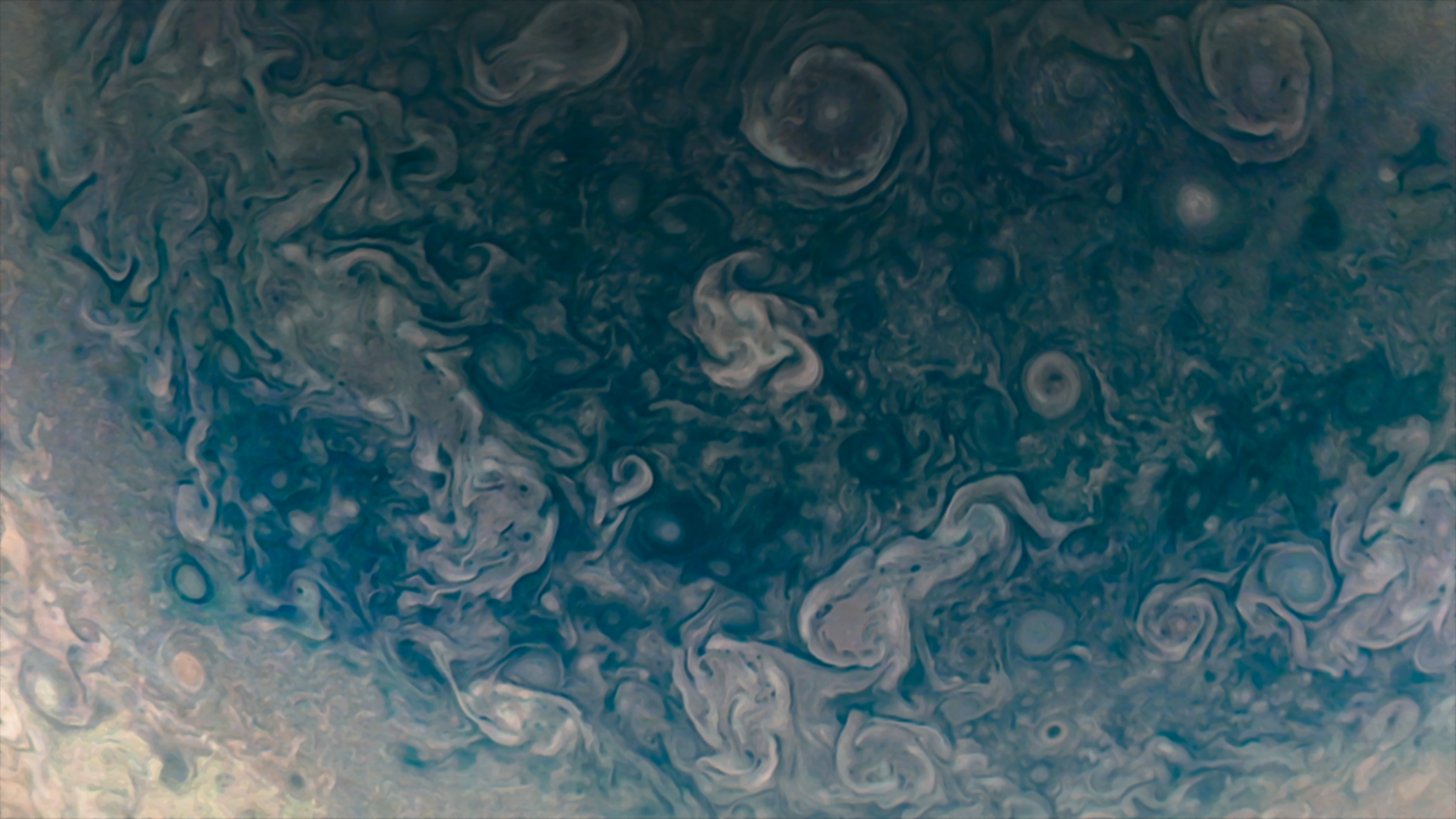 Processed using the JunoCam imager's PJ42 Northern Circumpolar Cyclones raw images and data from NASA's Juno spacecraft flyby on May 23, 2022. Enhanced to highlight features, clouds, colours, and the beauty of Jupiter. Artist's impression - not representative of true colour.