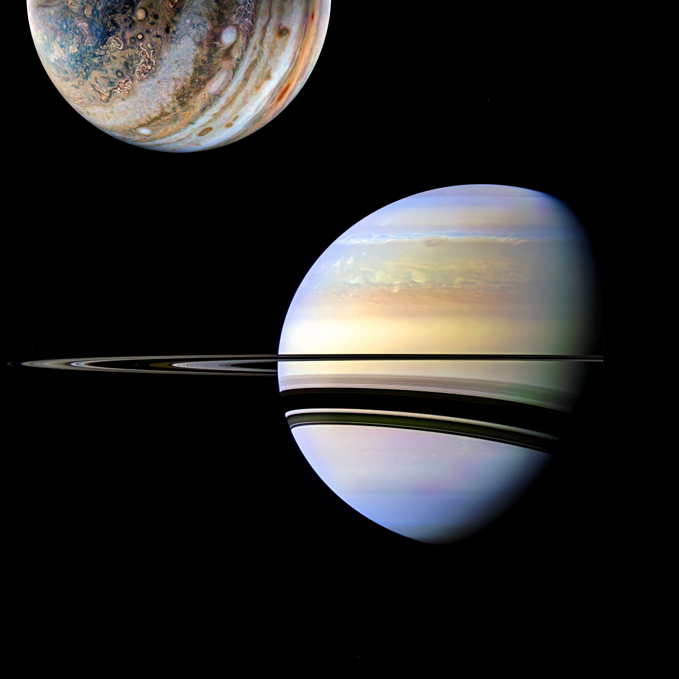 Saturn : Enhanced RGB (BL1, Green and Red) in visible light and enlargement of an image taken by Cassini spacecraft - Jupiter : Enhanced RGB (Blue, Green and Red) in visible light and enlargement of an image taken by Juno spacecraft