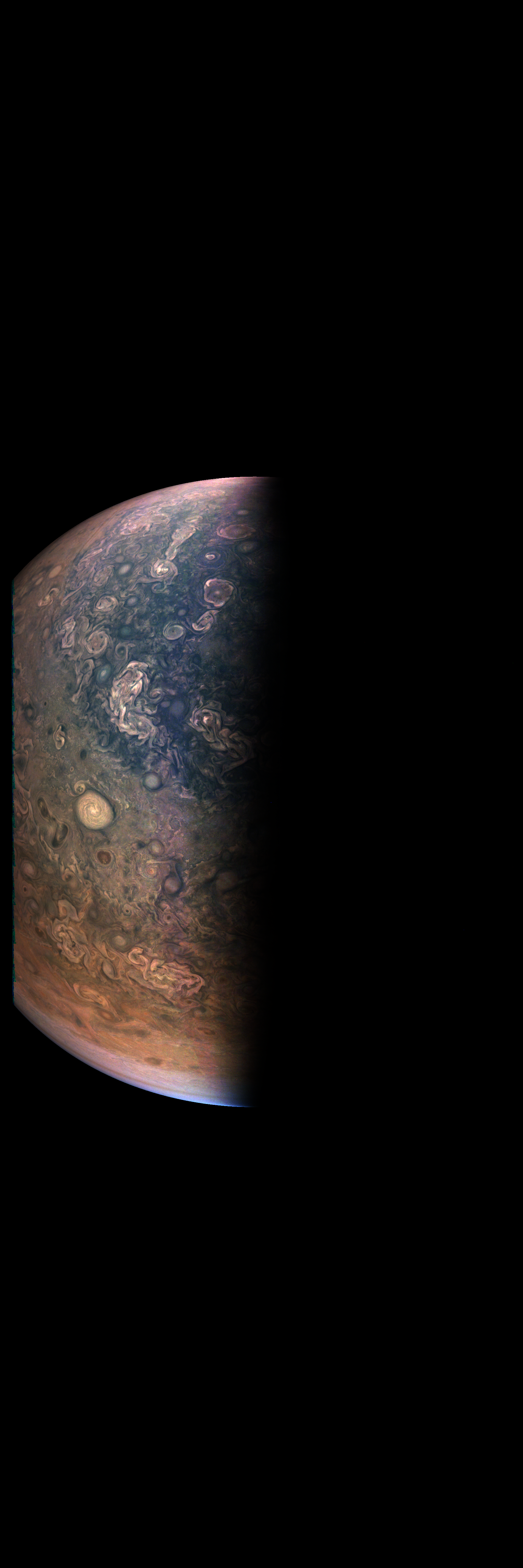 Junocam pixels are 12 bits deep from the camera but are converted to 8 bits inside the instrument using a lossless "companding" table, a process similar to gamma correction, to reduce their size. All Junocam products on the missionjuno website are in this 8-bit form as received on Earth. Scientific users interested in radiometric analysis should use the "RDR" data products archived with the Planetary Data System, which have been converted back to a linear 12-bit scale.