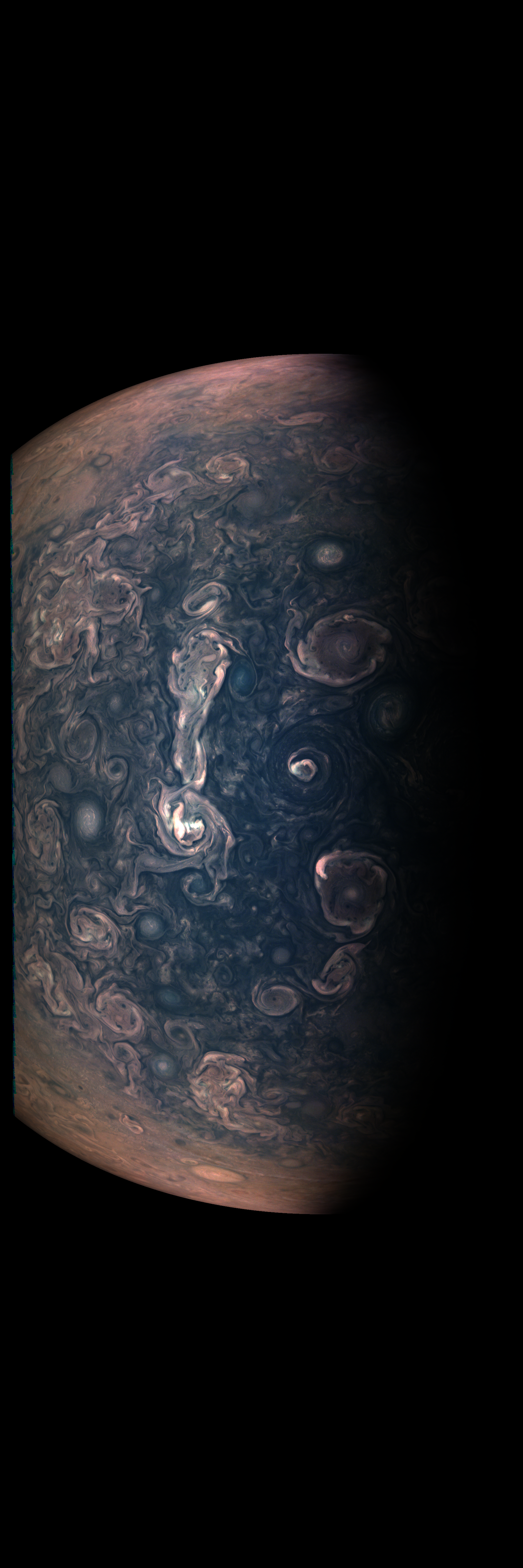 Junocam pixels are 12 bits deep from the camera but are converted to 8 bits inside the instrument using a lossless "companding" table, a process similar to gamma correction, to reduce their size. All Junocam products on the missionjuno website are in this 8-bit form as received on Earth. Scientific users interested in radiometric analysis should use the "RDR" data products archived with the Planetary Data System, which have been converted back to a linear 12-bit scale.