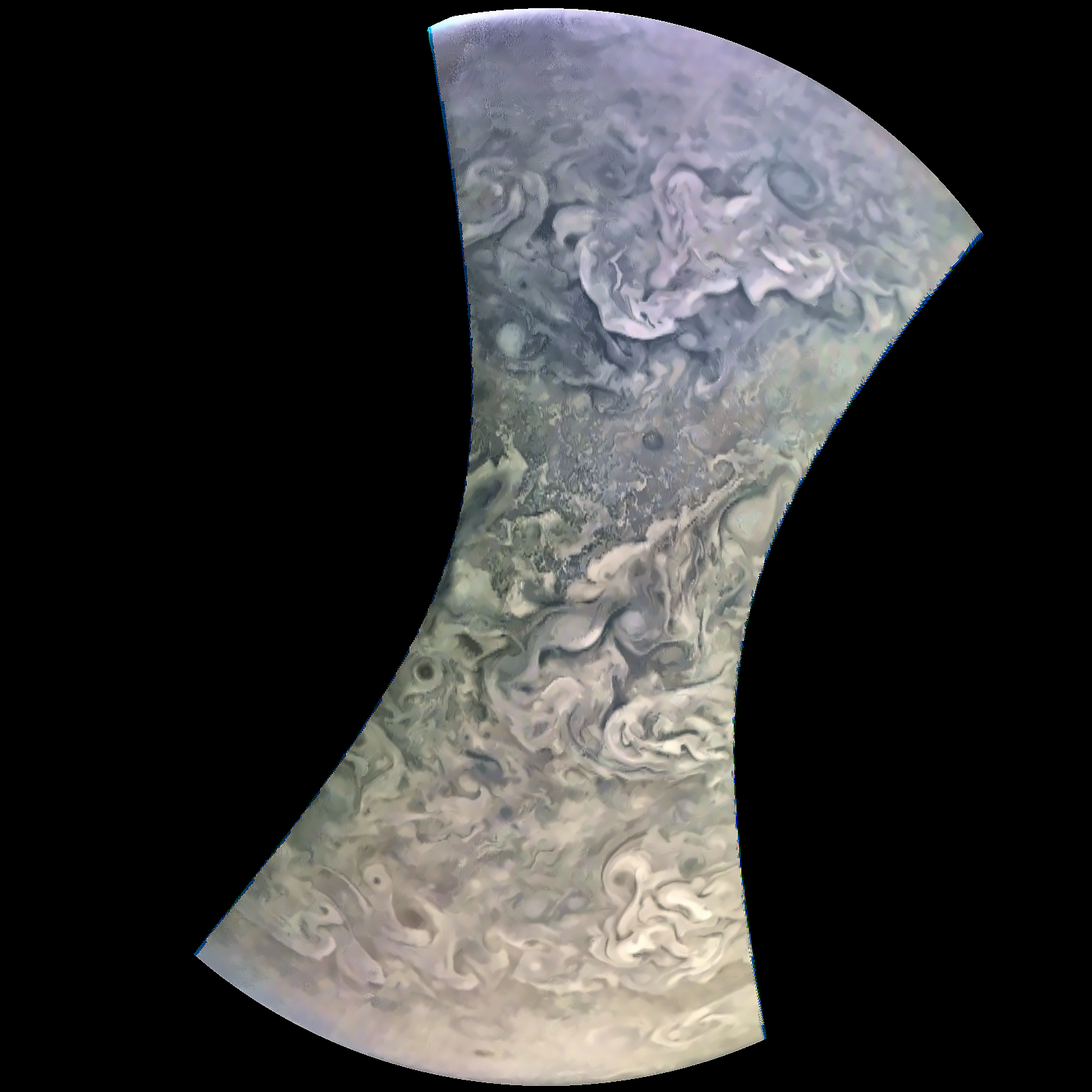 Junocam pixels are 12 bits deep from the camera but are converted to 8 bits inside the instrument using a lossless "companding" table, a process similar to gamma correction, to reduce their size. All Junocam products on the missionjuno website are in this 8-bit form as received on Earth. Scientific users interested in radiometric analysis should use the "RDR" data products archived with the Planetary Data System, which have been converted back to a linear 12-bit scale.