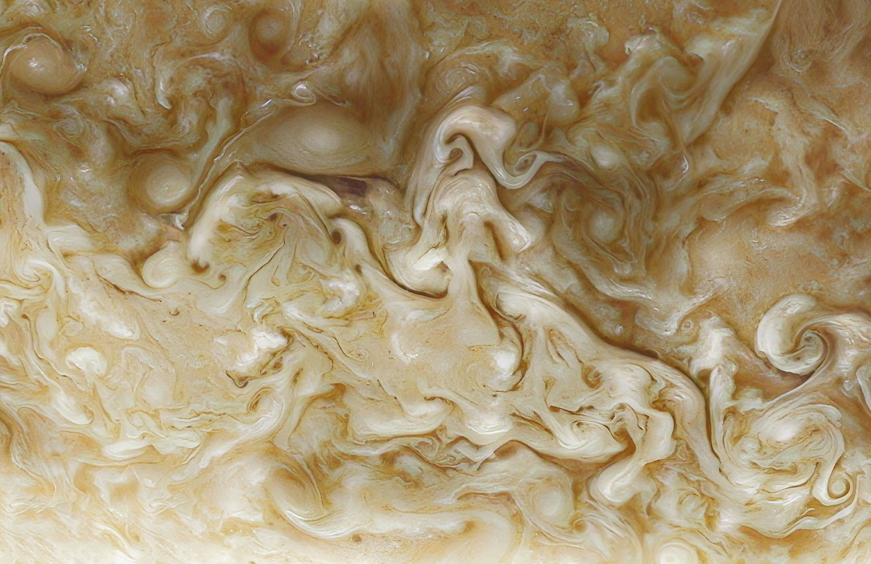 This false-color image, created using raw image data from Junocam (PJ34-46), looks like an art piece. Taken by Junocam on 2021-06-08 at an altitude of 27,686km above the cloud tops, it showcases the intricate details and beauty of Jupiter's cyclonic landscape