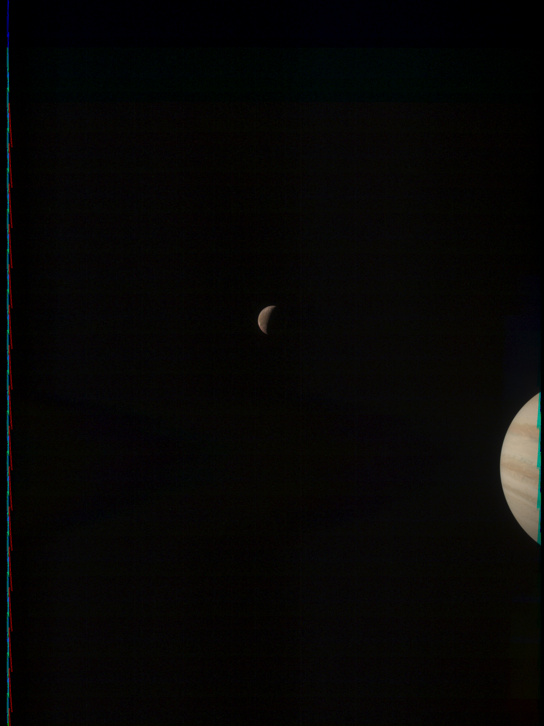 The image contains camera artefacts and energetic particle hits. After considering this, on the other hand, it may also show features on Io, or next to it, that may be clipped from reprojected images.