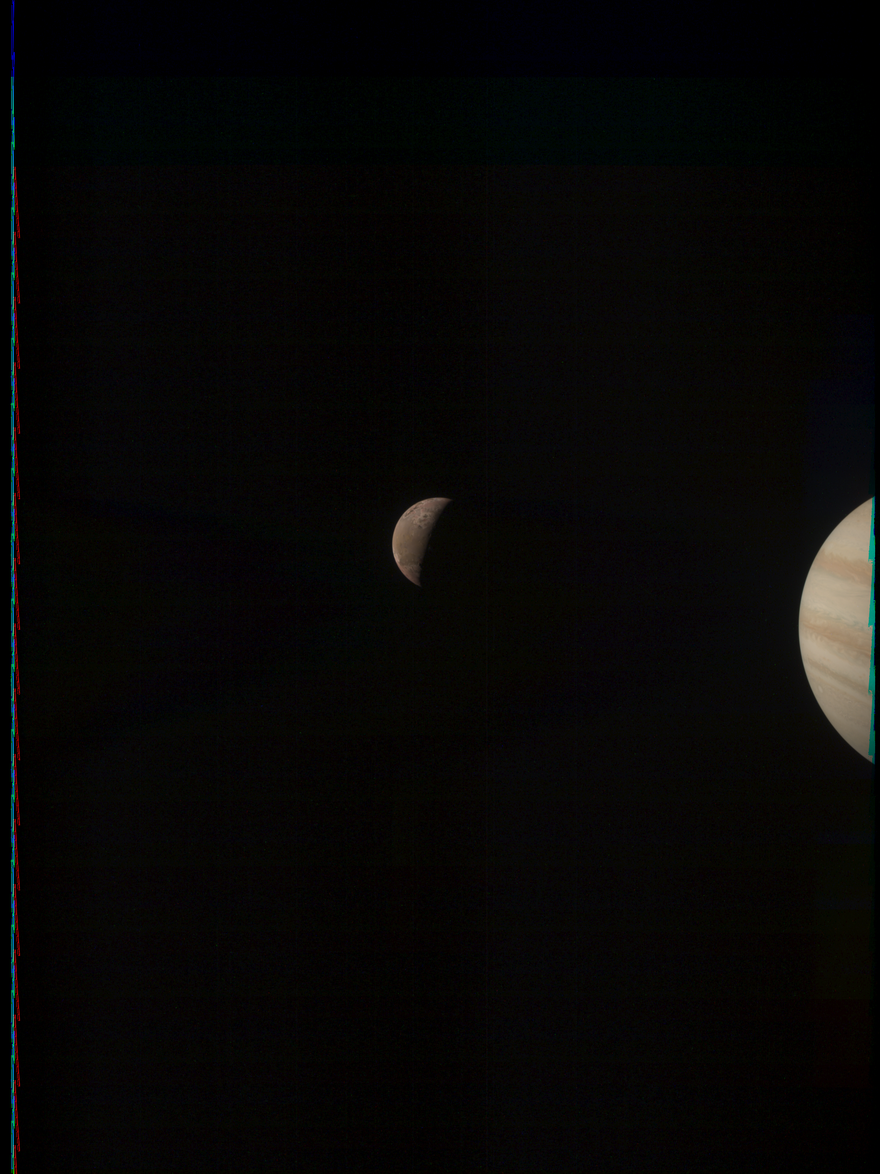 The image contains camera artefacts and energetic particle hits. After considering this, on the other hand, it may also show features on Io, or next to it, that may be clipped from reprojected images.