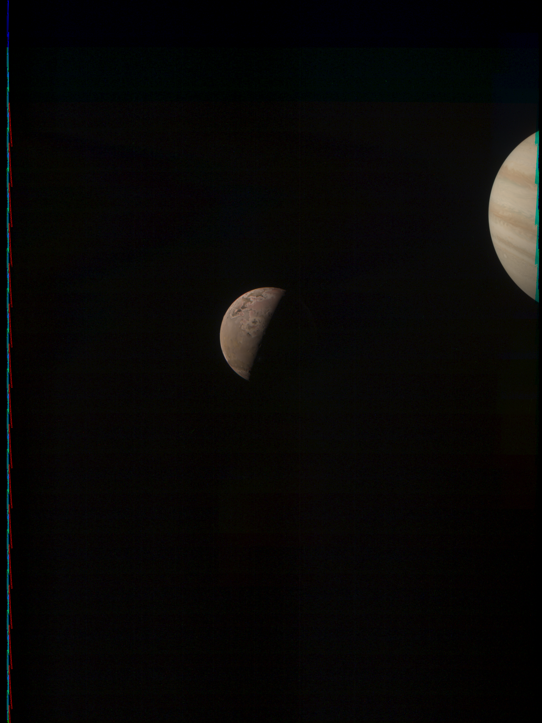 The image contains camera artefacts and energetic particle hits. After considering this, on the other hand, it may also show features on Io, or next to it, that may be clipped from reprojected images.