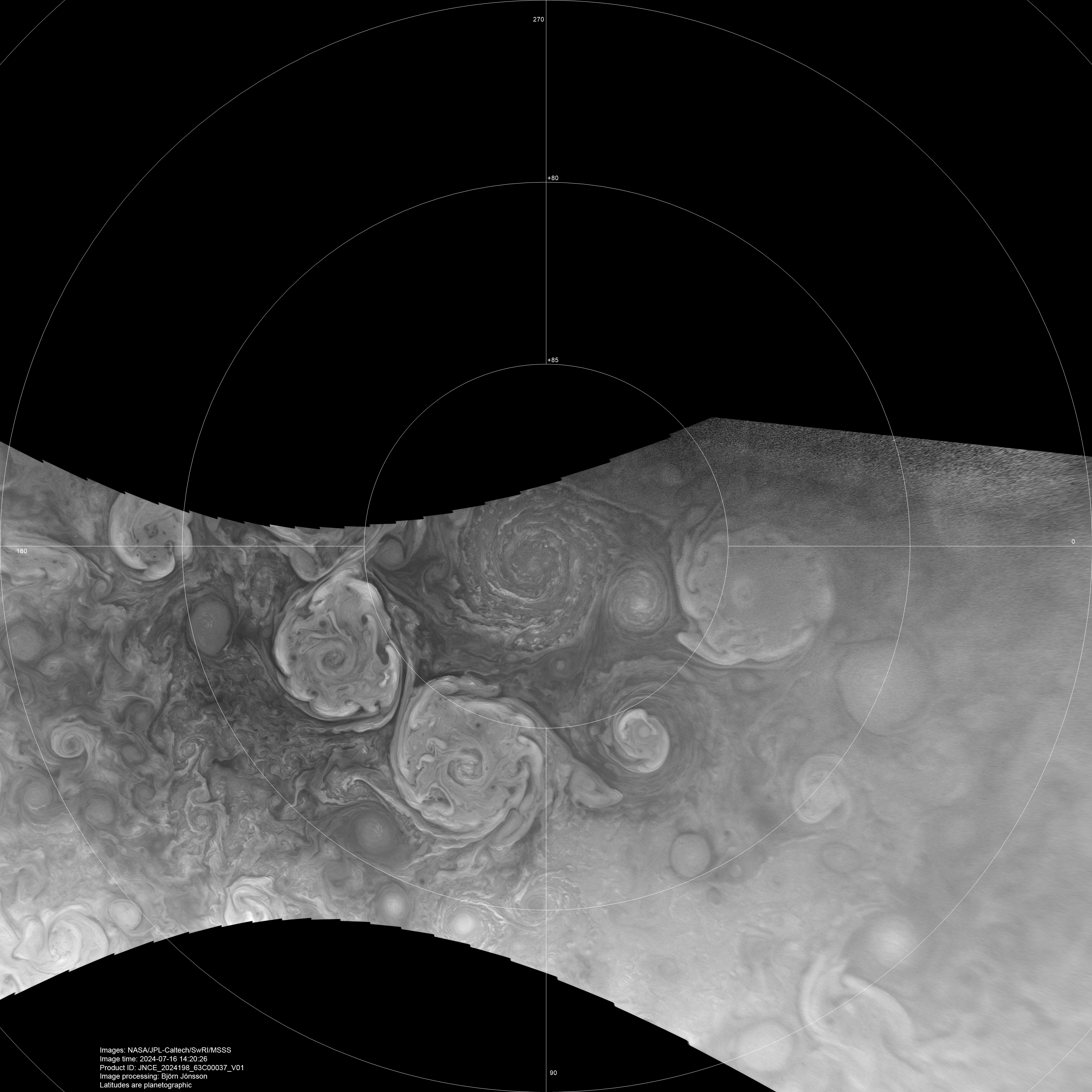 The contrast has been enhanced. Many details can be seen in the central north polar cyclone, for example the exact center of the cyclone is obvious. The appearance of the central cyclone reminds me a bit of Saturn's north polar vortex. This is the best view I have seen of the central cyclone despite the fact that due to viewing geometry constraints, a small part of its periphery is outside the image edge in the original data.