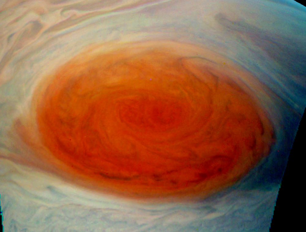 Enhancement of color, vibrance, contrast to focus in on the cloud swirls within the GRS