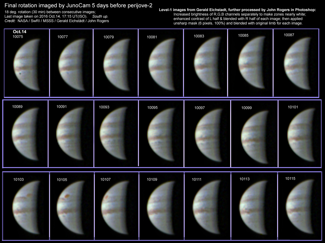 These 21 images were taken by JunoCam on 2016 Oct.14, covering one rotation of the planet. They were the last images taken before Perijove-2. The raw images were provided by the JunoCam team, and Gerald Eichstädt did ‘Level 1’ processing – assembling the strips, and aligning and merging the three colour channels. I then enhanced the images as described. South is up in the raw images and I have left them that way. -- John Rogers.