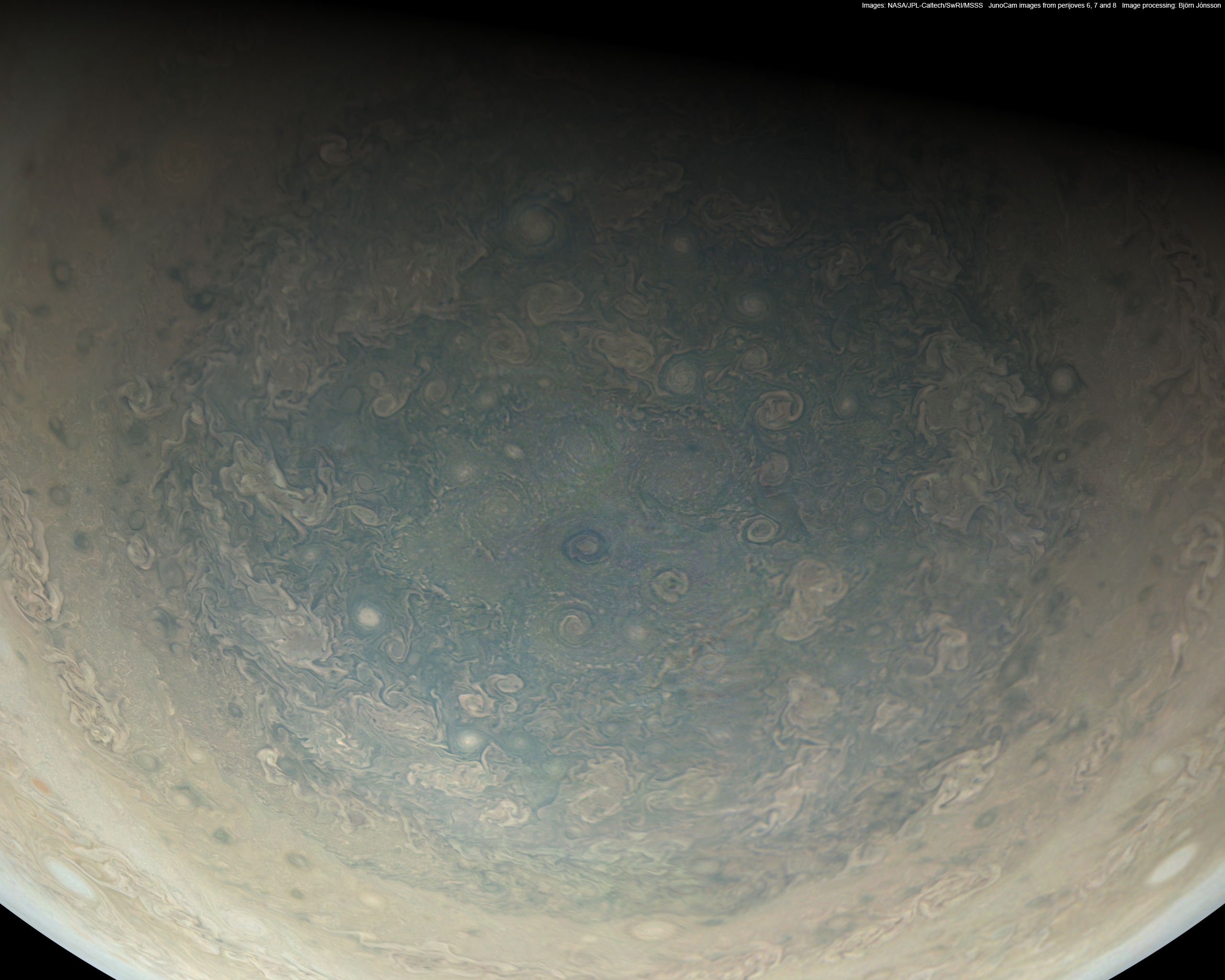 This image is based on JunoCam images obtained during perijoves 6, 7 and 8 that have been mosaicked to cover the entire south polar region. Here the "subspacecraft latitude" is 65 degrees south. This is an approximately true color/contrast view.