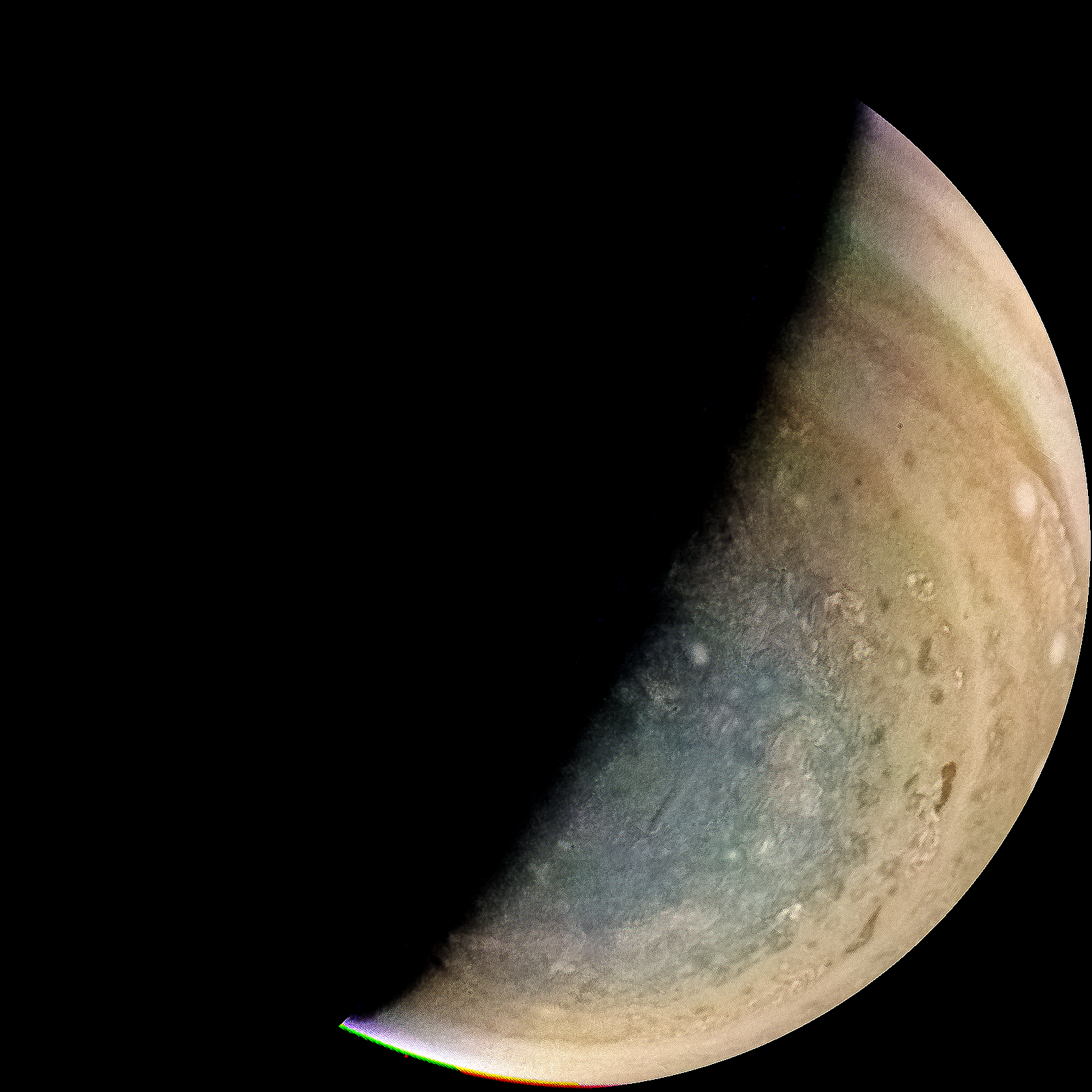 Junocam pixels are 12 bits deep from the camera but are converted to 8 bits inside the instrument using a lossless "companding" table, a process similar to gamma correction, to reduce their size. All Junocam products on the missionjuno website are in this 8-bit form as received on Earth. Scientific users interested in radiometric analysis should use the "RDR" data products archived with the Planetary Data System, which have been converted back to a linear 12-bit scale.