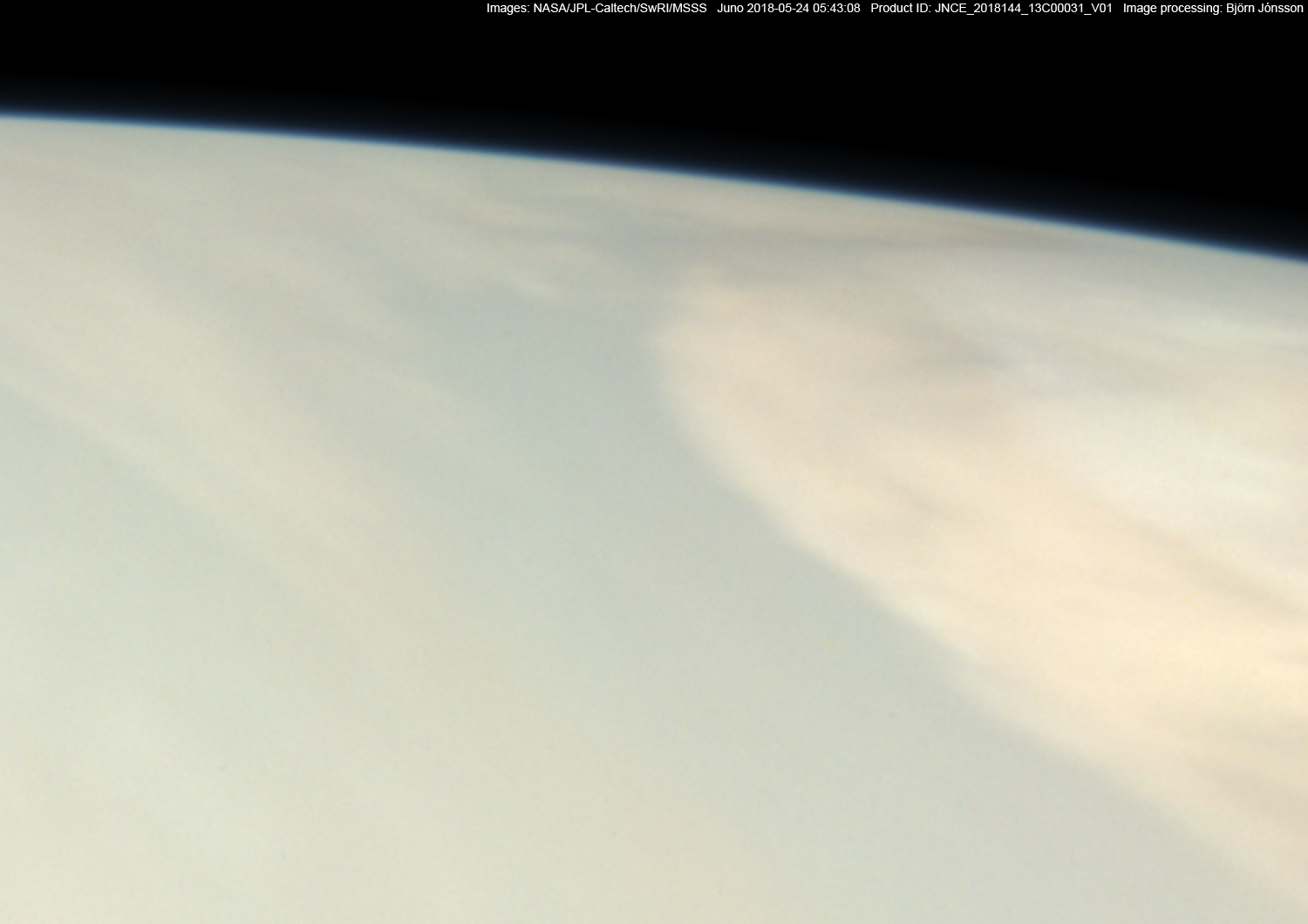 An approximately true color/contrast image showing details from perijove 13 image number 31. Compared to the original data this image has been enlarged by a factor of 3 to better show Jupiter's blue sky at the limb. The brightness of the blue sky at the limb has also been increased slightly relative to the brightest parts of the image.