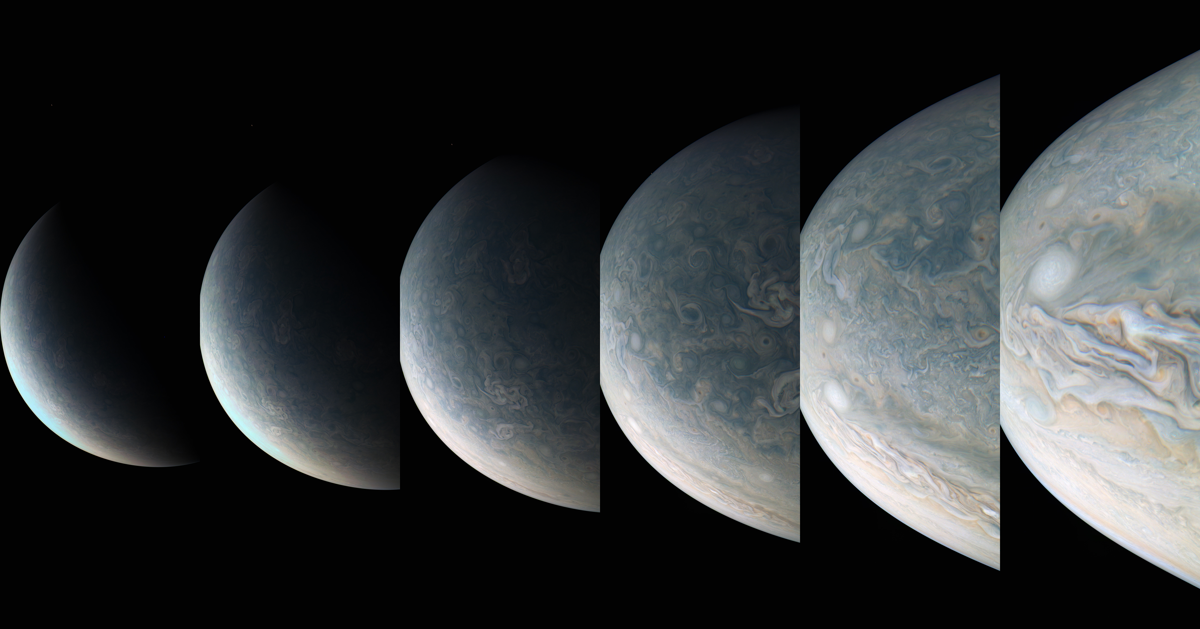 A special note about the Earth Flyby mission phase images: these were acquired in 2013 when Juno flew past Earth. Examples of processed images are shown; most contributions are from amateurs.
